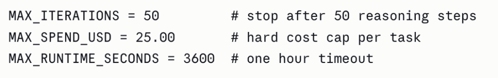 - Set your runtime constants: add MAX_ITERATIONS, MAX_SPEND, and MAX_RUNTIME to every agent loop before anything goes live