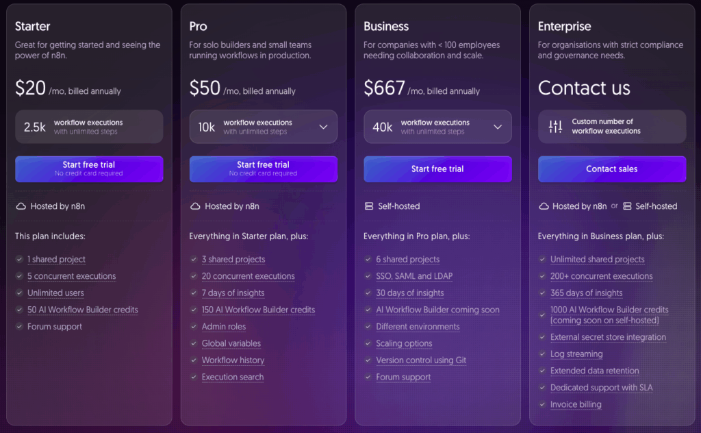 n8n also offers a fully functional open-source version that teams can self-host at no licensing cost. This provides maximum control over infrastructure and pricing, especially for organizations with the ability to manage deployments internally.