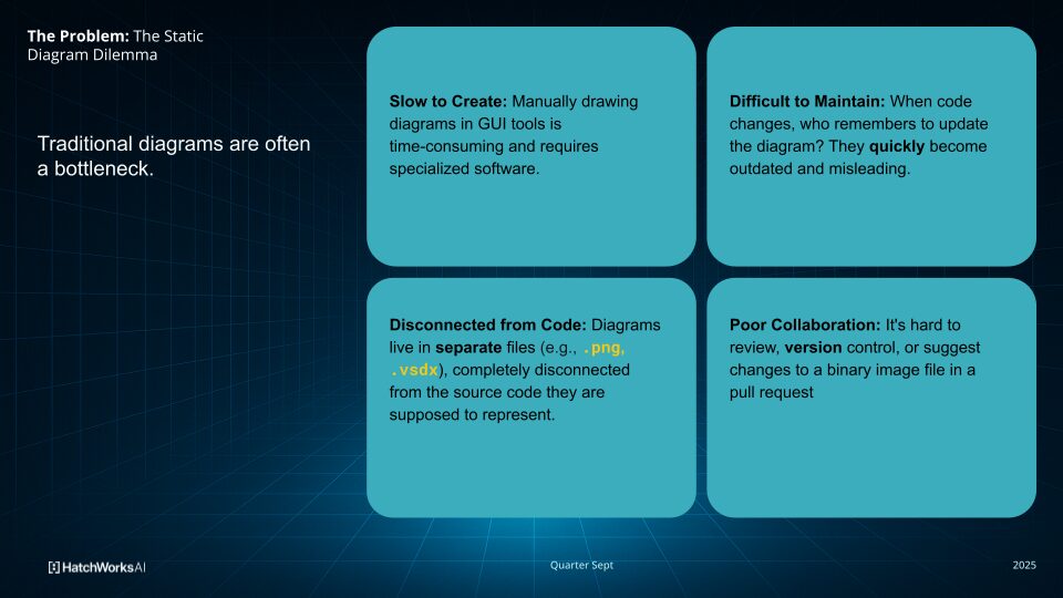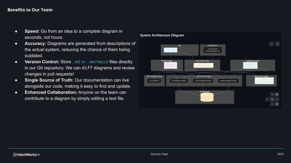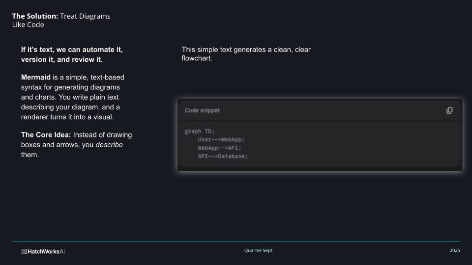 Mermaid works because diagrams become text: versioned, diffable, and reviewable like code. AI makes it usable at speed by producing solid first drafts from plain-English descriptions and repo context.