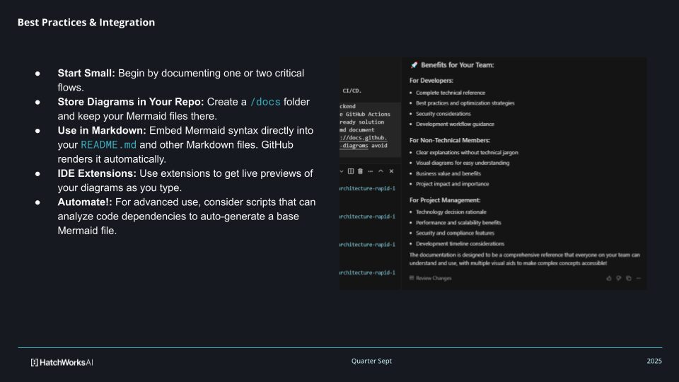 A practical flow: describe a system or flow → generate Mermaid syntax (system context, sequence diagrams, ERDs) → render and refine in GitHub/VS Code → store it in /docs. Keep docs GitHub-readable so they’re immediately usable.